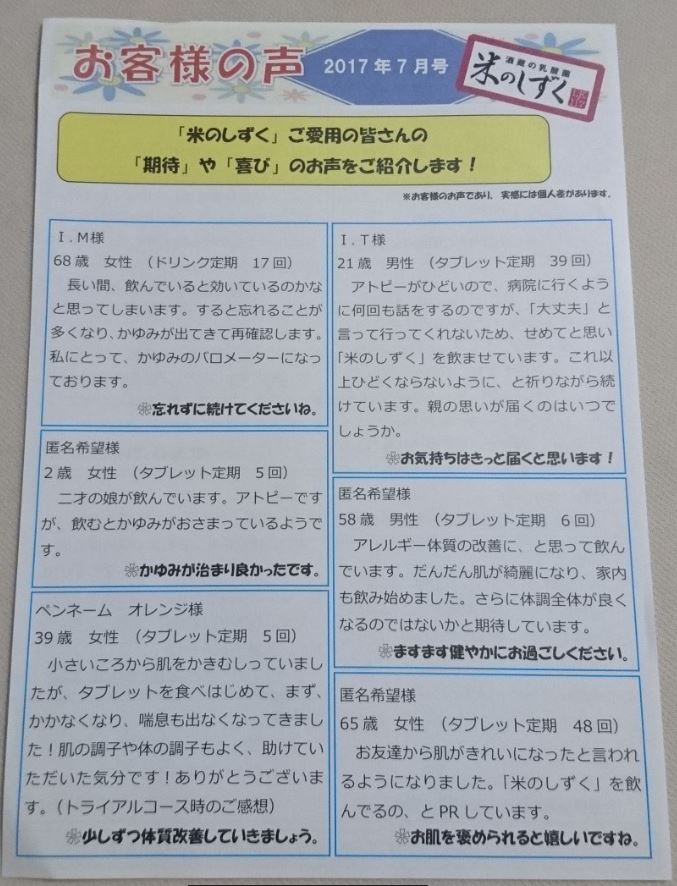 お客様の声としずく通信は米のしずくと一緒に送られてくるようです。